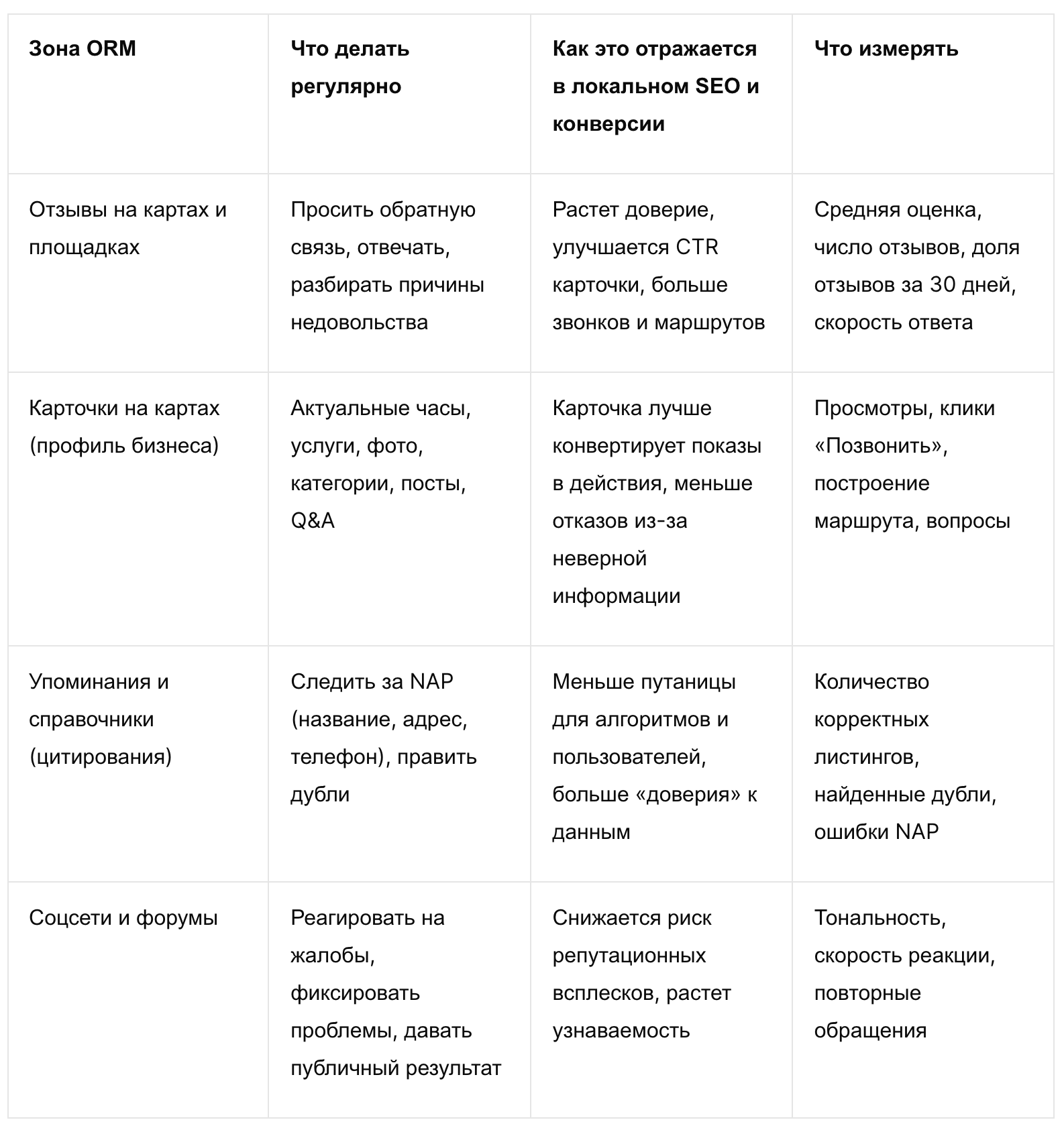 Ниже таблица, которая помогает связать действия ORM с измеримым результатом в локальном SEO и продажах.